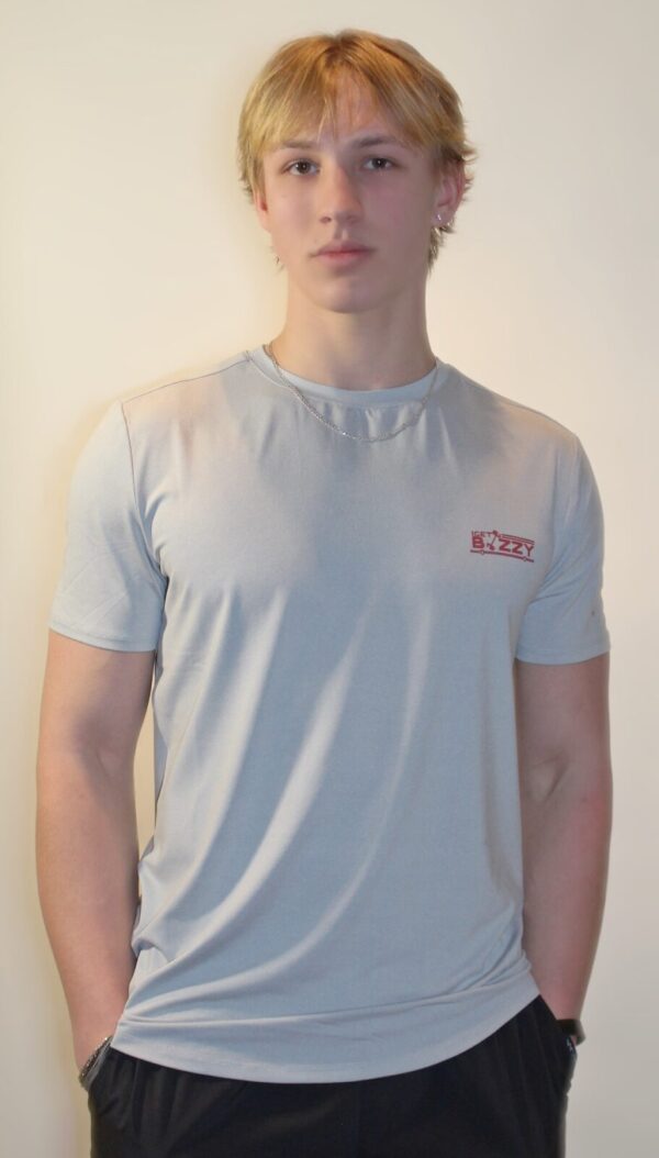 LEFT CHEST RED PRINT “I GET BIZZY” LOGO ON GRAY T-SHIRT