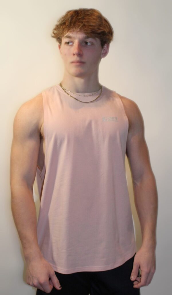 LEFT CHEST SILVER PRINT “I GET BIZZY” LOGO ON LIGHT PINK TANK TOP